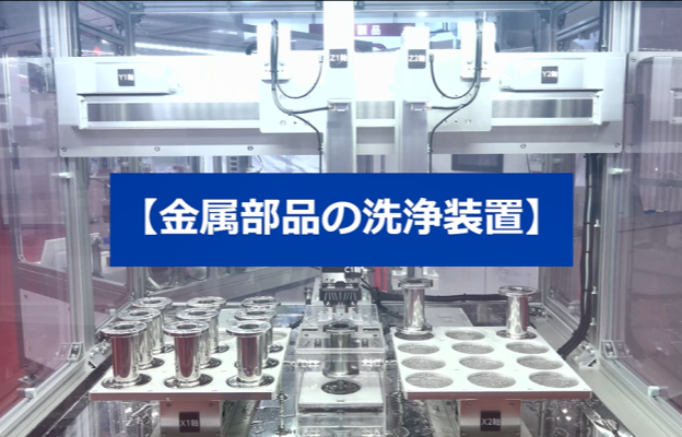 防塵防滴グリッパーを使い、金属部品を洗浄機へ投入します。