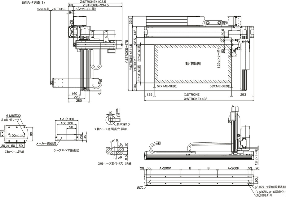 (注) ケーブルベア断面図の( )はYZ間のケーブルベア寸法です。