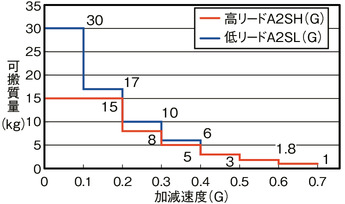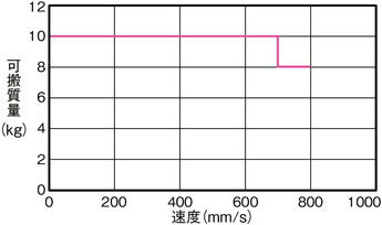 パルスモーターの特性上、速度が上がると可搬質量が低下します。