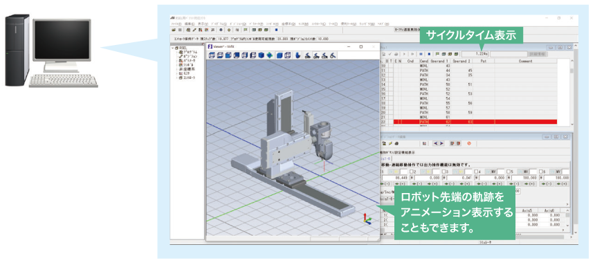直交型6軸ロボット本体がなくてもXSEL用パソコン専用ティーチングソフト(バージョンV14,00,01,00以降)を使用して、ロボットの動きを確認できます。さらにサイクルタイムの計算もできます。