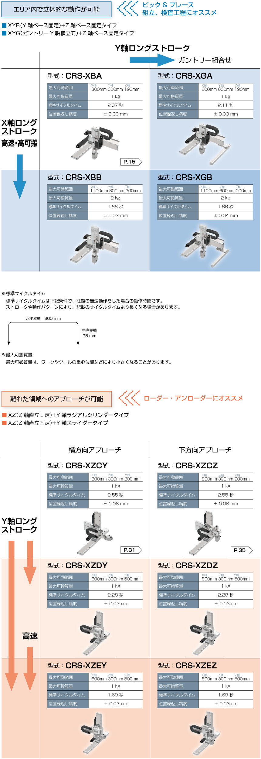 搬送重量や移動ストローク、設置スペースに合った組合わせ方向の選択が可能です。